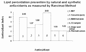 Curcuminoids were shown to prevent lipid peroxides formation in a significantly higher degree than the pine bark extract, grape seed extract or the commonly used synthetic antioxidant BHT, in an in vitro study.15 This study employed a conventional test procedure called the "Rancimat Method". The test measures the conductivity changes caused by the formation of small free fatty acid molecules, when fats and oils undergo experimentally induced accelerated rancidity or oxidative changes. Pure lard is used for the preparation of test samples containing 0.02% by weight of the antioxidant being tested. The results of these experiments are indicated in the Figure 2. The particular blend of curcuminoids (2) used in the above experiment is known as C3 -Complex which has been shown to be more effective as an antioxidant than each of the components curcumin, demethoxy curcumin or bisdemethoxy curcumin used alone.15