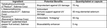 Curcuminoids-rich extract from turmeric rhizomes is well known for its antioxidant properties, antimicrobial effects, and beneficial effects on inflammation. Turmeric has been traditionally used by South Asian women in skin care since ancient times. However, its yellow color may not blend well with cosmetic formulations. An innovative colorless (white to very light tan) derivative, Tetrahydrocurcuminoids, addresses this drawback, and offers effective protection against sun damage. Its antioxidant action is of a comprehensive "bioprotectant" nature, efficiently preventing the formation of free radicals, while quenching pre-formed ones as well, thereby protecting the skin cells from damage by UV radiation and the resultant inflammation and injury. This in turn has far reached beneficial effects on overall health and well being, rendering a healthy glow to the skin. Tetrahydrocurcuminoids are therefore useful in brightening and lightening skin tone, and offer protection against the development of melanoma (1, 8, 9). The bioprotectant effect of curcuminoids (4) and tetrahydrocurcuminoids is further validated in welldocumented experiments related to anti-tumor activity. The addition of 0.5 to 10 micromoles of curcumin to an in vitro skin cell culture inhibited the activity of the enzyme ornithine decarboxylase which has been linked to the promotion of tumor cell growth. Thus curcumin has the capability to inhibit genetic change (mutation) in the cells, that often initiates the aging process, and contributes to cancer development. Traditionally, turmeric from which curcuminoids and tetrahydrocurcuminoids are derived, has been used in the ancient system of Indian medicine, Ayurveda in a variety of internal and topical uses. Documented traditional topical uses include application to the ear in chronic otorrhea, as a cooling eyewash to relieve purulent opthalmia, as a topical treatment for pemphigus (an allergic and inflammatory skin condition), in viral conditions such as shingles and chickenpox to facilitate the process of healing, and as a dressing applied to bruises, sprains, found that curcuminoids can be effectively applied in the treatment of precancerous lesion called leukoplakia (usually affecting oral mucosa).