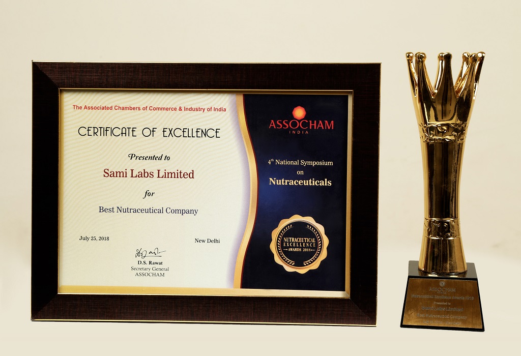 Em reconhecimento à louvável contribuição à exportação farmacêutica da Índia, a Sami Labs foi honrada com o Prêmio “Excelência no Desempenho de Exportação” para o Ano de 2017-18, na categoria Produtos Herbais e Farmacêuticos Aliados - Prata.