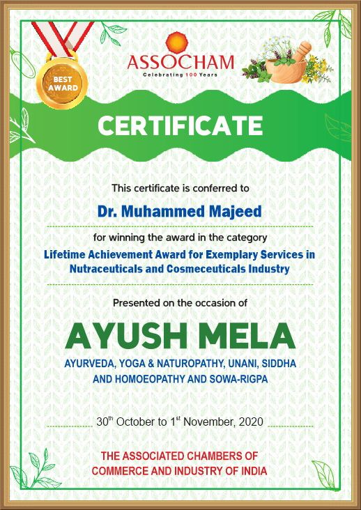 O prestigioso prêmio pelo reconhecimento de conquista vitalícia foi apresentado ao Dr. Muhammed Majeed, Fundador e Presidente do Grupo Sami-Sabinsa, em reconhecimento por seus serviços exemplares na indústria Nutracêutica e Cosmecêutica. O prêmio foi concedido pela ASSOCHAM (Associação das Câmaras de Comércio e Indústria da Índia) durante a Ayush Mela, que é uma das maiores exposições e conferências virtuais da Índia relacionadas a Ayurveda, Ioga e Naturopatia, Unani, Siddha e Homeopatia, realizada de 30 de outubro a 1º de novembro de 2020. A Sami-Sabinsa Group Limited, pioneira e líder mundial em Ciências da Saúde, é a principal produtora de nutracêuticos, cosmecêuticos, extratos herbais padronizados, substâncias químicas finas, substâncias químicas especiais, probióticos e enzimas.