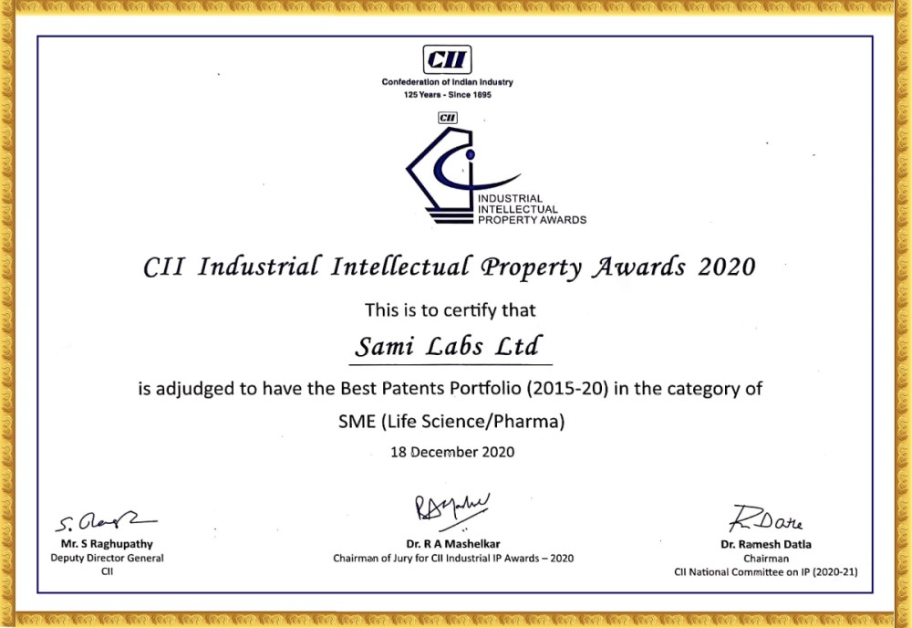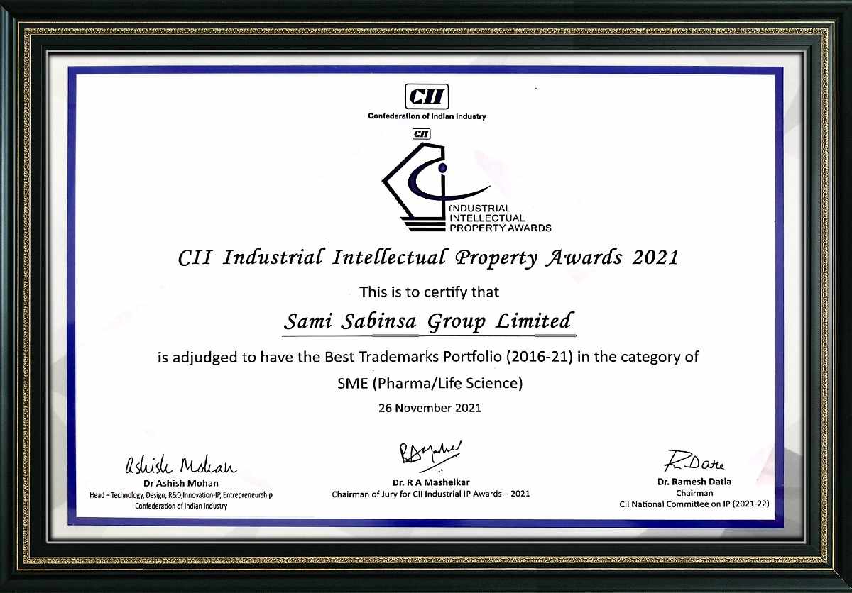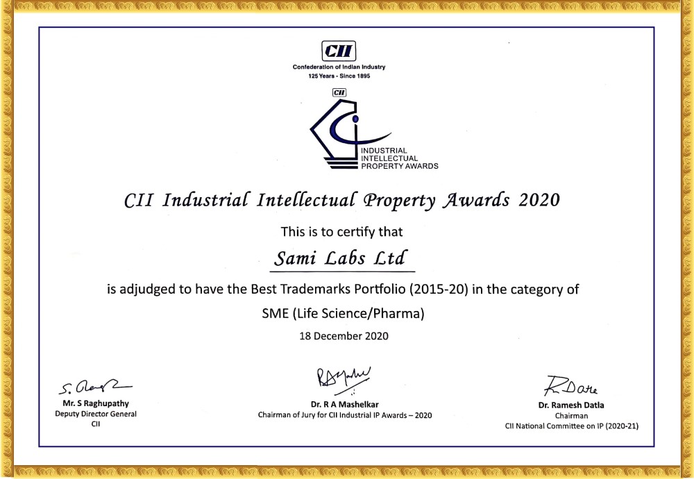 O Grupo Sami-Sabinsa, pioneiro e líder mundial em Ciência da Saúde foi honrado com o prêmio de Melhor Portfólio de Patentes em SME (Ciência da Vida e Farmacêutica) e Melhor Portfólio de Marcas Registradas em SME (Ciência da Vida e Farmacêutica) no prêmio de Propriedade Intelectual Industrial da CII realizado virtualmente em 18 de dezembro de 2020.