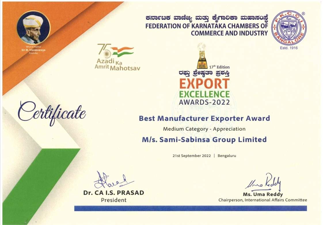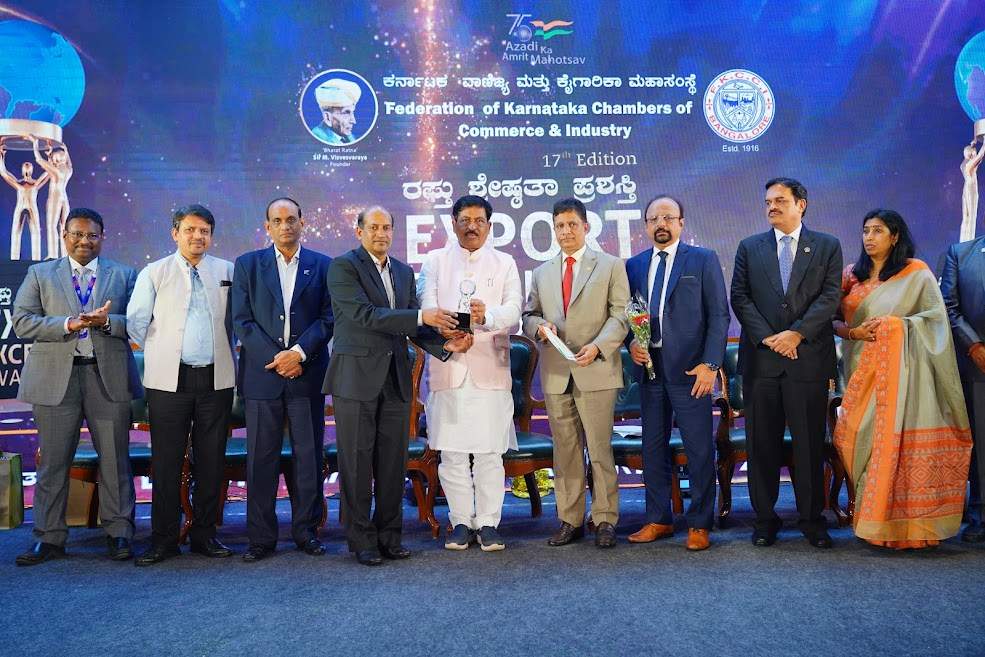 Sami-Sabinsa Group is honoured with the "Best Manufacturer Export Award 2022" by the Federation of Karnataka Chambers of Commerce and Industry (FKCCI) in Bengaluru on September 21, 2022.